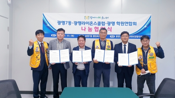 [금요저널] 광명시 광명7동 행정복지센터와 광명7동 지역사회보장협의체는 지난 3일 광명라이온스클럽, 광명시 학원연합회와 나눔 문화 실천을 위한 협약을 체결했다.