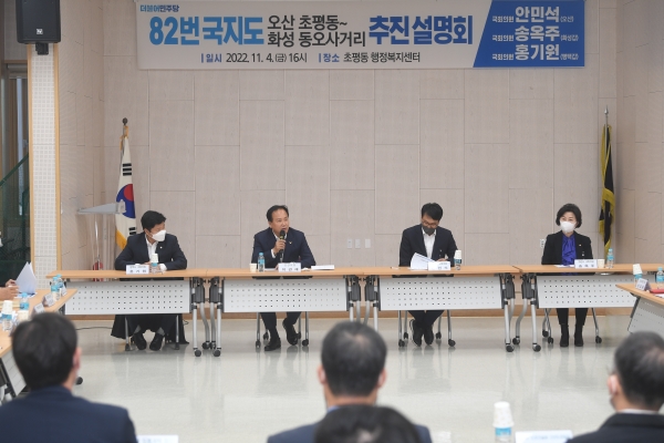 초평동행정복지센터에서 오산·화성·평택 국회의원, 시의원, 지역주민 50여명이 참석한 가운데 사업 주체인 경기도 도로건설과에서 나와 사업 진행 상황 등을 설명했다.