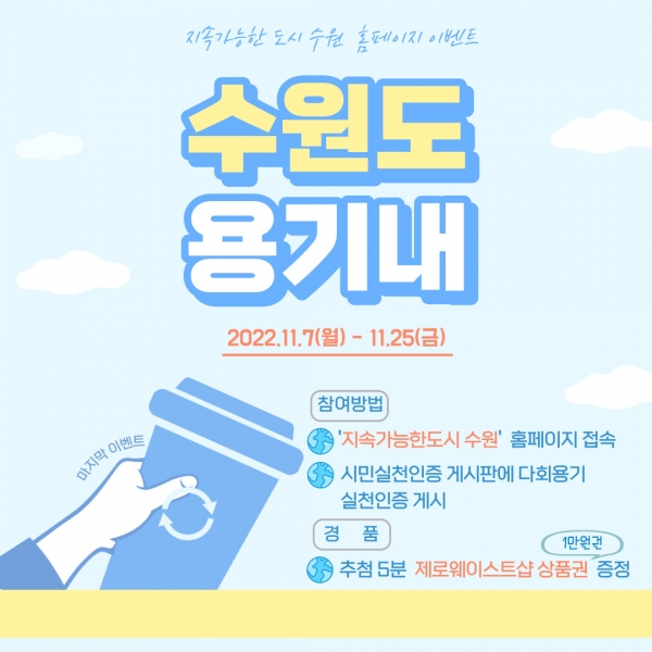 11월 7일부터 25일까지 수원시 홈페이지에서 ‘시민참여→지속가능한 도시 수원’이나 ‘시민참여 배너→지속가능한 도시 수원 이벤트 배너’로 접속해 ‘시민실천인증’ 게시판에 다회용기 사용 실천 인증 사진을 게시하면 된다.