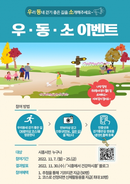 [금요저널] 시흥시는 지역사회에 건강 친화적 생활환경을 확대하고 걷기 실천율을 높이기 위해 ‘우·동·소’ 이벤트를 11월 7일부터 25일까지 진행한다.