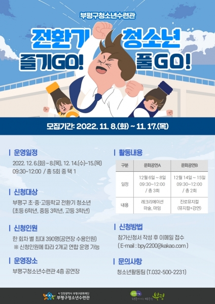 [금요저널] 부평구 청소년수련관이 오는 17일까지 ‘2022 전환기 청소년 즐기GO 풀GO 참가학교’ 참가자를 모집한다.