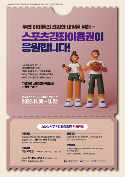 스포츠강좌이용권 지원사업은 체육활동을 하고 싶지만 경제적으로 참여가 어려운 취약계층 유·청소년과 장애인을 대상으로 1인당 매월 9만5,000원 범위 내에서 지정된 가맹시설 스포츠강좌의 수강료를 지원하는 사업이다.