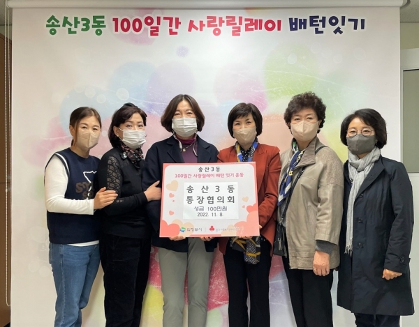 [금요저널] 의정부시 송산3동행정복지센터는 11월 8일 송산3동 통장협의회에서 ‘송산3동 100일간 사랑릴레이 배턴잇기’에 성금 100만원을 기탁했다고 밝혔다.