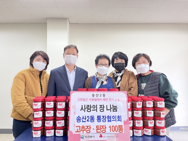 [금요저널] 의정부시 송산2동주민센터는 11월 7일 100일간 사랑릴레이 배턴잇기에 동참해 취약계층을 위해 된장, 고추장 각 50통을 기탁했다고 밝혔다.