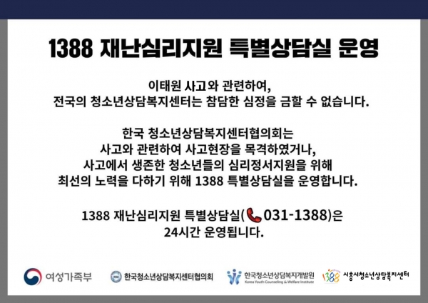 사고를 직접 목격하거나, 친구·가족·지인의 사고로 심리적 어려움을 겪고 있는 경우 또는 사고를 직접적으로 목격하지 않았더라도, 언론이나 누리소통망 등을 통해 사건을 접한 후 불안하거나, 두통, 식사 또는 수면 문제, 주의집중 등의 일상생활에 어려움이 있는 만 9세에서 24세 청소년은 각 지역 청소년상담복지센터 특별상담실을 통해 전문 상담을 받을 수 있다.