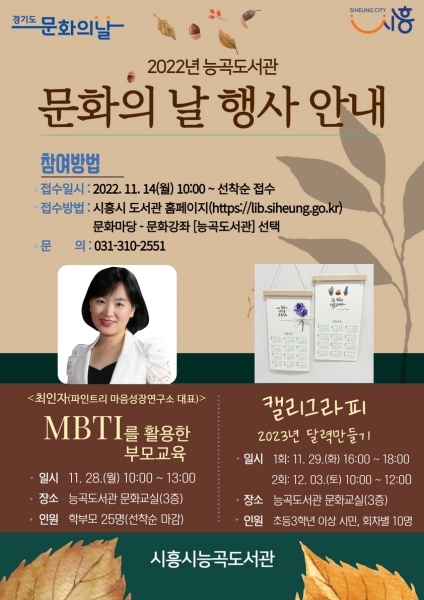 [금요저널] 시흥시 능곡도서관은 2022 경기도 문화의 날 ‘11월 기획프로그램’으로‘MBTI를 활용한 부모교육’과 ‘캘리그라피 2023년 달력만들기’행사를 열고 참가 시민을 선착순으로 모집한다.