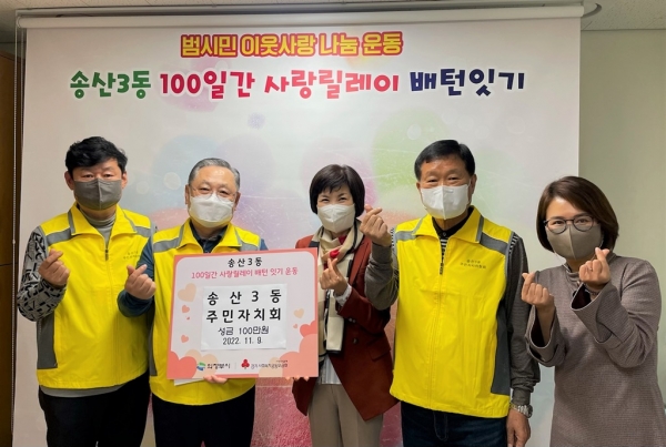 [금요저널] 의정부시 송산3동행정복지센터는 11월 9일 송산3동 주민자치회가 어려운 이웃을 돕기 위한 ‘송산3동 100일간 사랑릴레이 배턴잇기’에 성금 100만원을 기탁했다고 밝혔다.