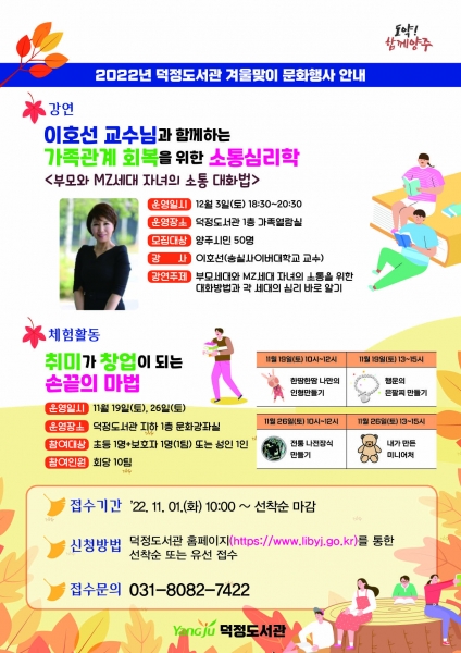 [금요저널] 양주시 덕정도서관은 오는 12월 3일 오후 6시 30분에 이호선 교수와 함께 ‘가족관계 회복을 위한 소통심리학, 부모와 MZ세대 자녀와 소통 대화법’이라는 주제로 강연을 개최한다.