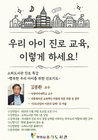[금요저널] 광명시 소하도서관은 오는 19일 학부모와 학생을 위한 진로 특강 ‘우리 아이 진로 교육, 이렇게 하세요’를 운영한다.
