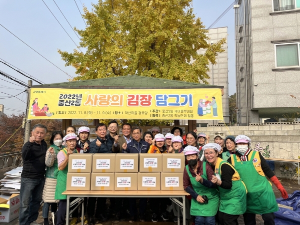 [금요저널] 고양특례시 일산동구 중산2동 행정복지센터는 새마을부녀회 와 4개 직능단체 회원들이 참여한 가운데 11월 8일과 9일 양일간 ‘2022년 사랑의김장담그기’ 행사를 펼쳤다.