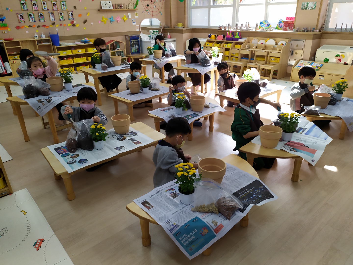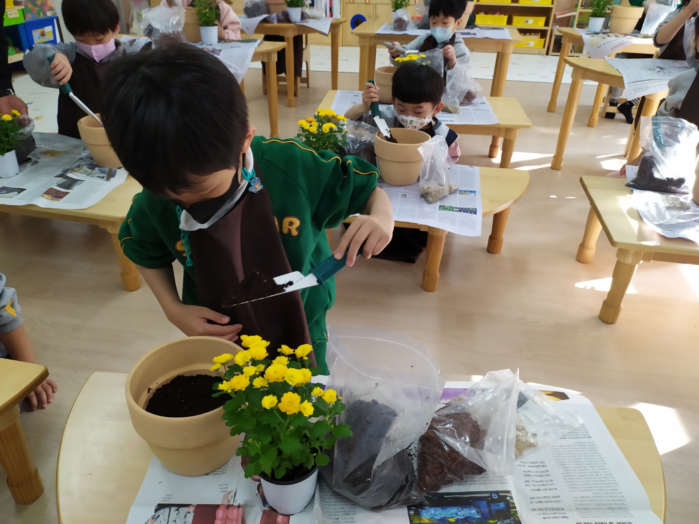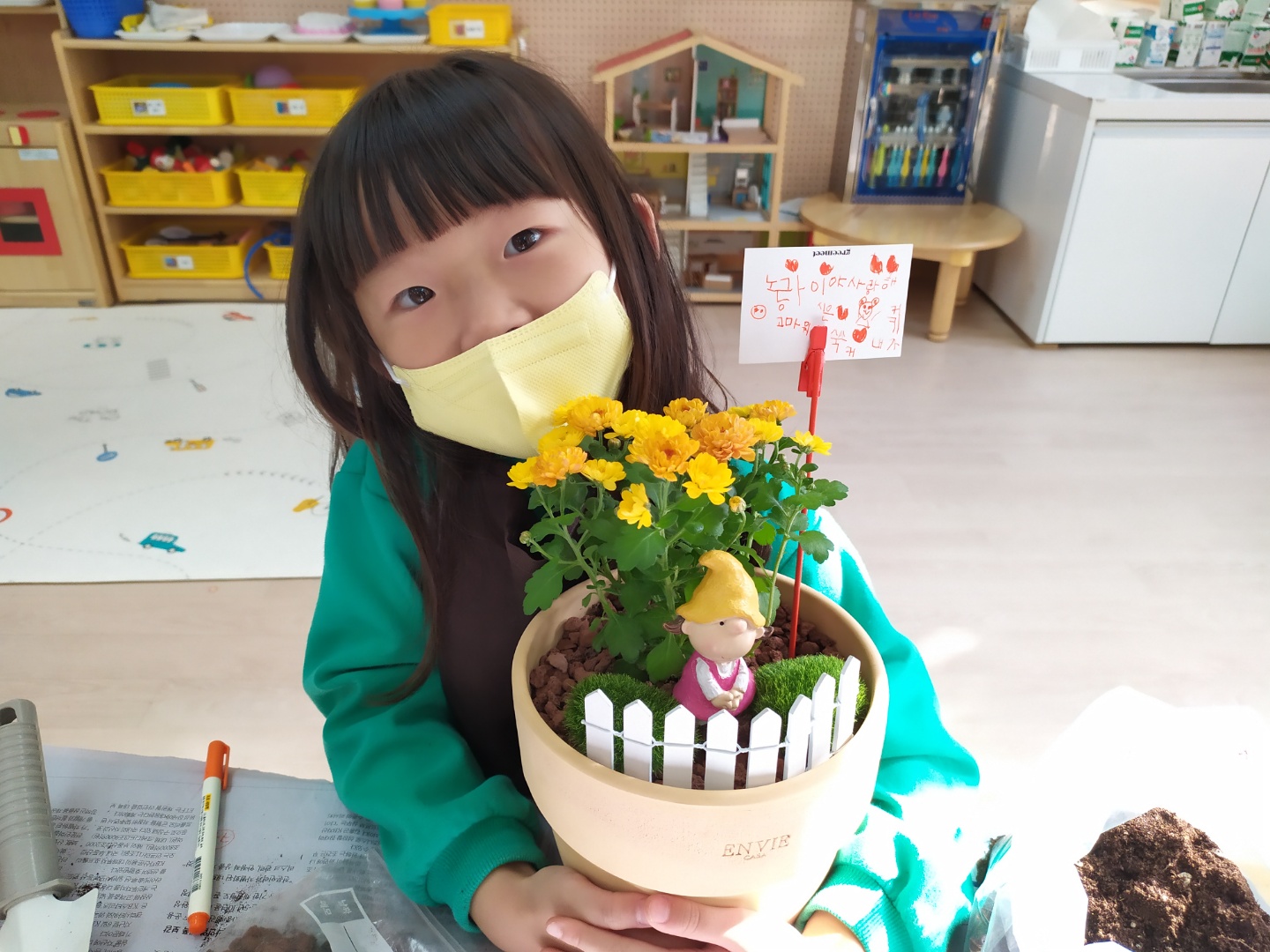 □ 유아들은 먼저 화분에 들어가는 흙과 돌에 관심을 가지며 만져보며 촉감을 탐색한 뒤 국화꽃의 모양과 향기, 색깔을 관찰하고 느낌을 이야기해보았다. 그리고 국화꽃을 화분에 심는 방법을 귀 기울여 듣고 스스로 화분에 돌과 흙을 차례로 넣은 뒤 국화를 심고 다양한 소품으로 꾸며 국화 정원을 완성하였다. 마지막으로 유아들은 화분의 이름을 직접 지어주고 국화에게 해주고 싶은 말도 메모지에 적어서 꽂아주었다.