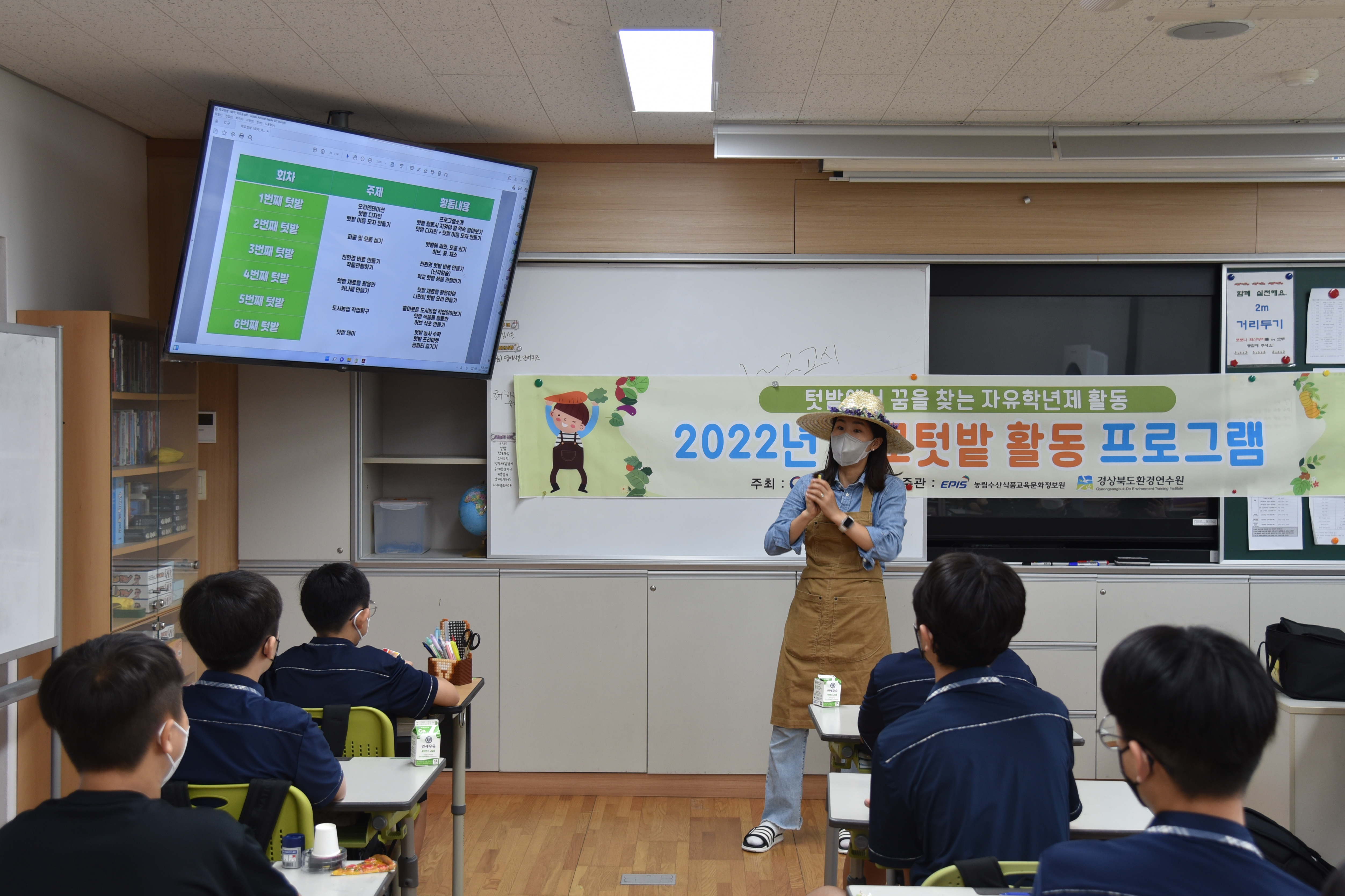 이 활동은 흙을 만지고 식물을 가꾸며 바르고 너그러운 인성 함양을 위한, 텃밭 가꾸기 활동이다. 교내 자투리 땅을 일구어 거름을 주고 배추와 무, 국화와 허브 작물을 심고 물을 주며 학생들이 가꾼다. 친환경 비료 제작, 텃밭 작물을 활용한 카나페 만들기, 꽂꽂이 등을 배우며 도시농업과 관련 직업에 대해서도 공부한다.