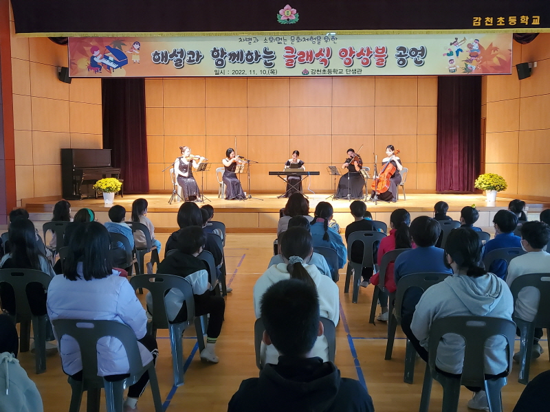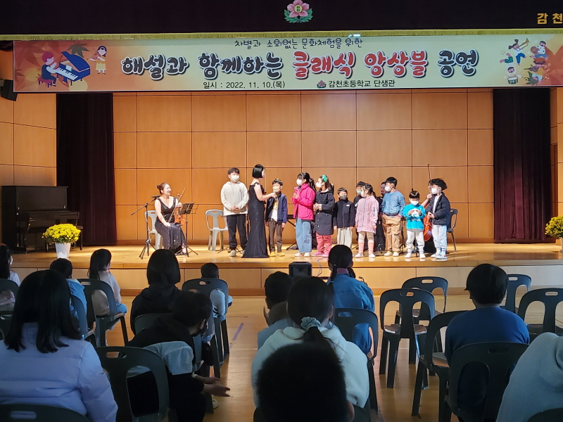 · 감천초등학교(교장 이수갑)은 11월 10일 전교생과 감천중학생들을 초청하여 단샘관에서 차별과 소외 없는 문화 체험을 위한 찾아오는 클래식 공연을 개최하였다.