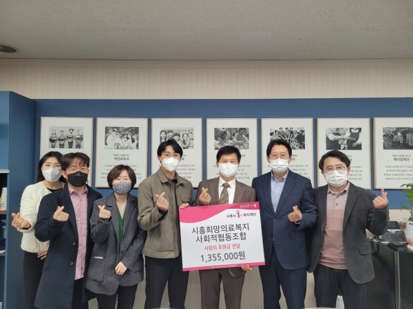[금요저널] 시흥희망의료복지사회적협동조합은 지난 10일 시흥시1%복지재단 통해 시흥시 무한돌봄센터에 사랑의 후원금을 전하며 관내 위기가구를 응원했다.