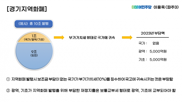 이 의원은 “지역화폐 10조원 발행을 가정하면 9조원은 도민이 직접 충전하고 1조원은 국가·광역·기초 지자체가 예산을 지원하게 되는데, 지역화폐로 소비가 일어날 경우 10%에 해당하는 지원금 상당액이 부가가치세 형태로 국가에 귀속된다”며 “2023년 국가는 지역화폐에 대한 재정을 전혀 부담하지 않는데도 광역·기초 지자체 지원금 상당액이 부가가치세 형태로 국가에 귀속되는 점은 불합리하므로 광역 및 기초 지자체가 지역화폐 발행을 위해 부담한 재정지출은 보통교부세 형태로 다시 광역·기초 지자체로 교부되어야 한다”고 설명했다.
