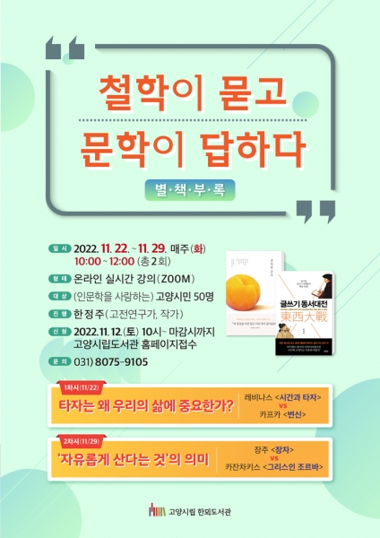 [금요저널] 고양특례시 한뫼도서관이 ‘철학이 묻고 문학이 답하다 ‘별·책·부·록’’ 강연을 온라인으로 운영한다.