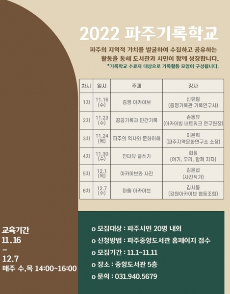 [금요저널] 파주시 중앙도서관은 오는 16일부터 다음 달 17일까지 중앙도서관에서 마을 기록활동가 양성을 위한 2022년 파주기록학교를 운영한다고 밝혔다.