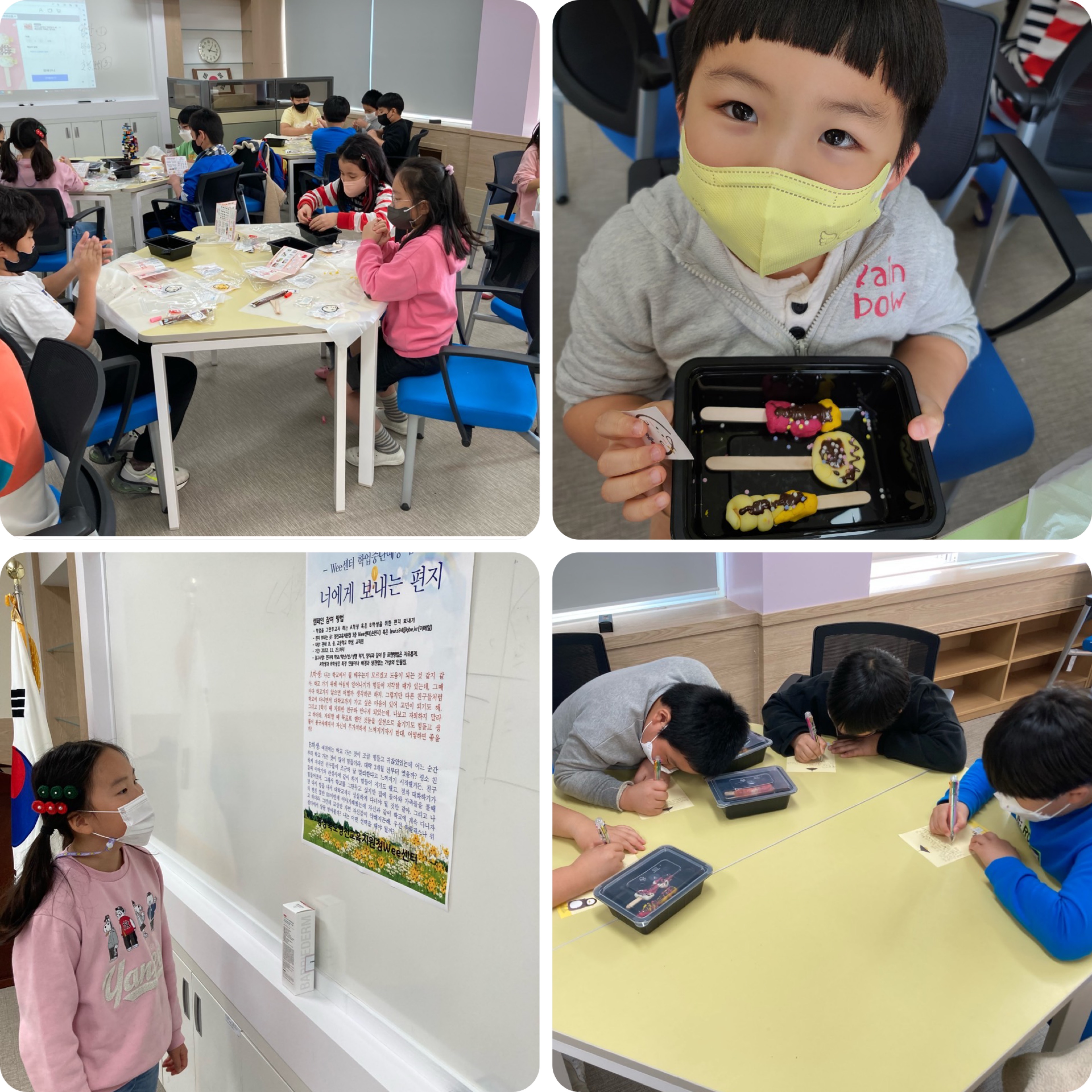 □ 오후에는 농민의 날을 기념하는 떡빼로를 만들어 친구 사랑 편지와 함께 자신의 마음을 전하는 시간을 가졌고, 학업 중단 위기에 놓인 학생들의 고민을 듣고 해당 학생에게 위로와 격려의 편지보내기 캠페인 활동에도 참여하였다. 학생들이 정성으로 쓴 편지는 영천교육지원청 Wee센터를 통해 해당 학생들에게 전달될 수 있도록 발송되었다.