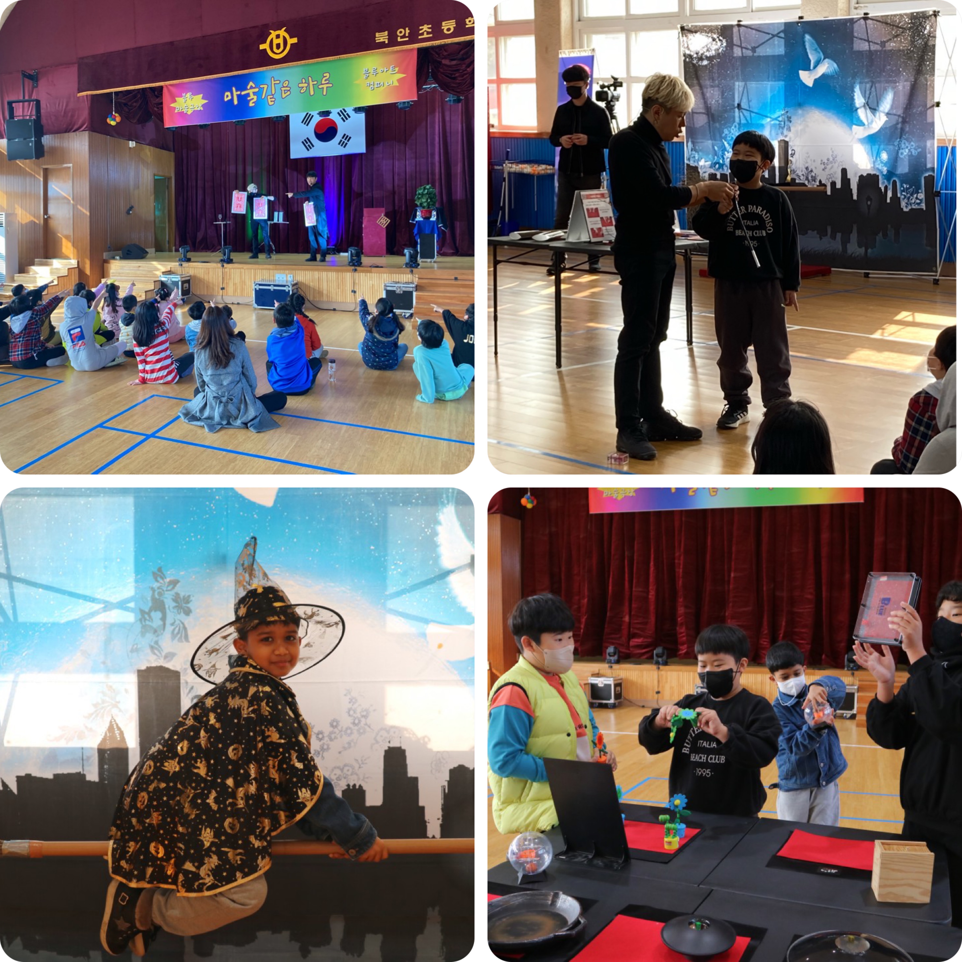 □ 마술 및 버블 체험은 아이들의 행복한 공연문화예술콘텐츠를 만드는 사회적 기업 ‘블루아트 컴퍼니’에서 학교로 방문하여 학생들에게 공연과 체험 활동을 제공하였다. 학생들은 먼저 마술공연을 감상한 뒤 마술도구와 창의도구존에서 배운 마술을 체험하고, 관련 의상들을 착용해보며 포토존에서 사진 찍는 시간을 가졌다. 이후 대형 버블과 관객참여형 버블 동굴 및 스모크버블 등으로 이루어진 ‘일루젼 버블쇼’를 관람하고 운동장으로 나가 공연 도구들을 체험해보았다.