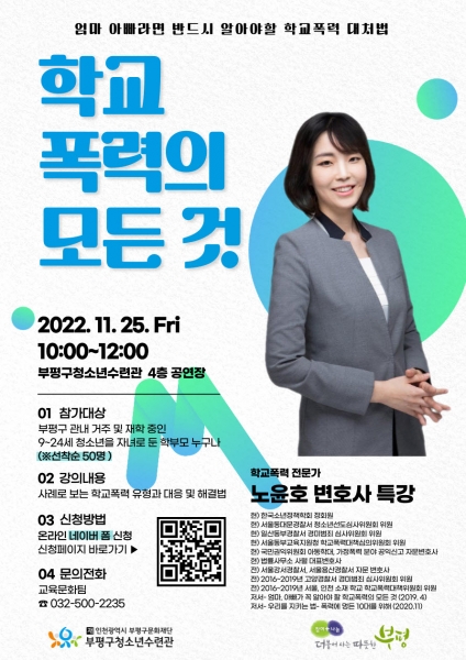 박건호 부평구 청소년수련관장은 “학부모들이 학교폭력 전문가와 함께 청소년 폭력에 대해 알고 다양한 프로그램을 통해 청소년 문제와 범죄 예방에 도움이 될 수 있도록 노력하겠다”고 말했다.