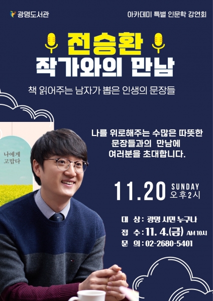 [금요저널] 광명시 광명도서관은 오는 20일 광명도서관 M층 강당에서 전승환 작가를 초청해 ‘책 읽어주는 남자가 뽑은 인생의 문장들’을 주제로 인문학 강연회를 개최한다.