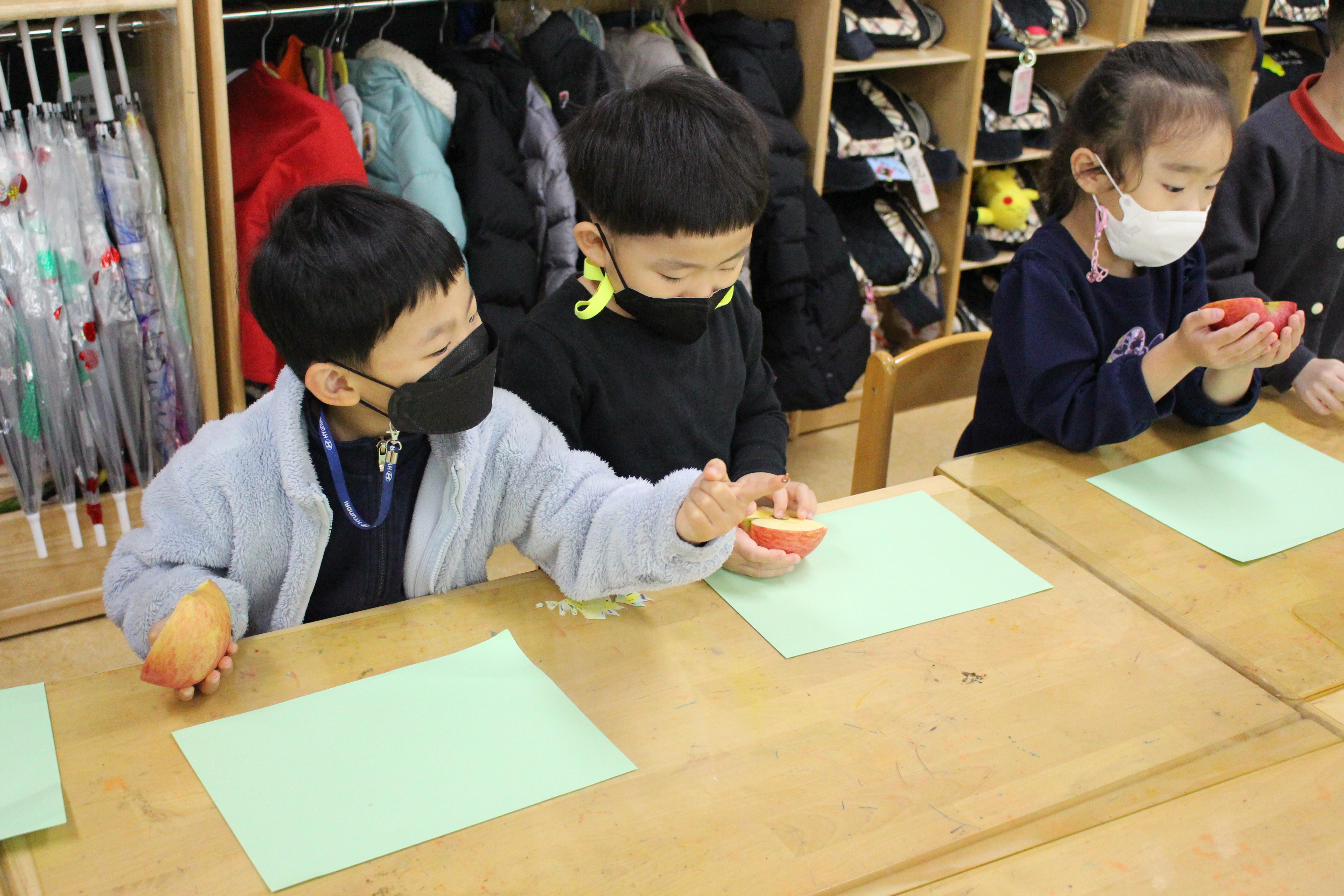 □ 유아들은 ‘사과’ 관련 그림책을 읽으며 사과에 관심을 가지기 시작하여 물감, 클레이 등 미술재료로 사과를 만들어보거나 사과를 잘라 사과의 겉과 속을 관찰하며 사과의 향, 색, 맛을 탐색하였다. 또한 손을 청결히 한 후에 사과를 맛보고, 사과상자를 직접 꾸며 사과를 담아 가정으로 가져가는 시간을 가졌다.