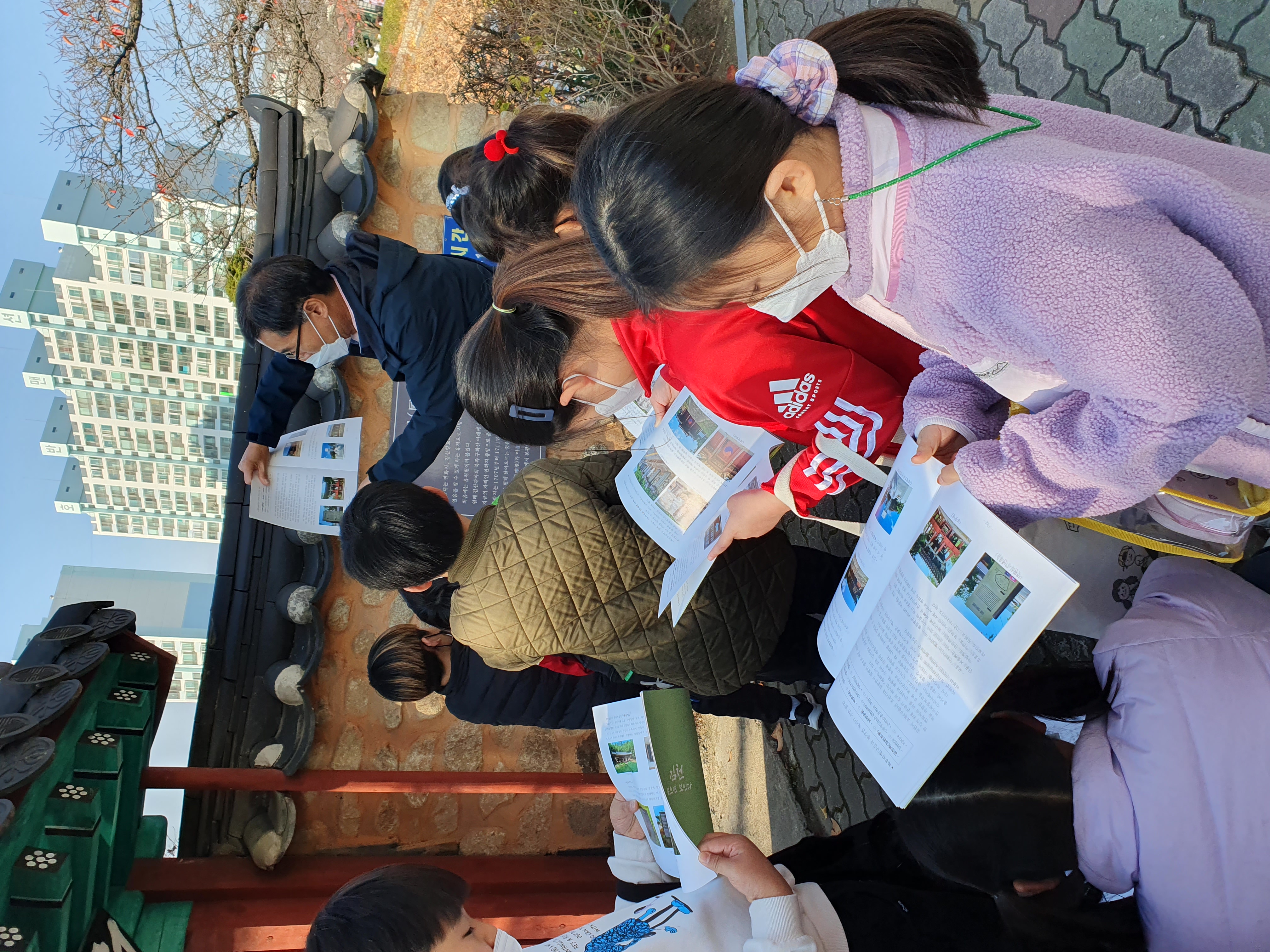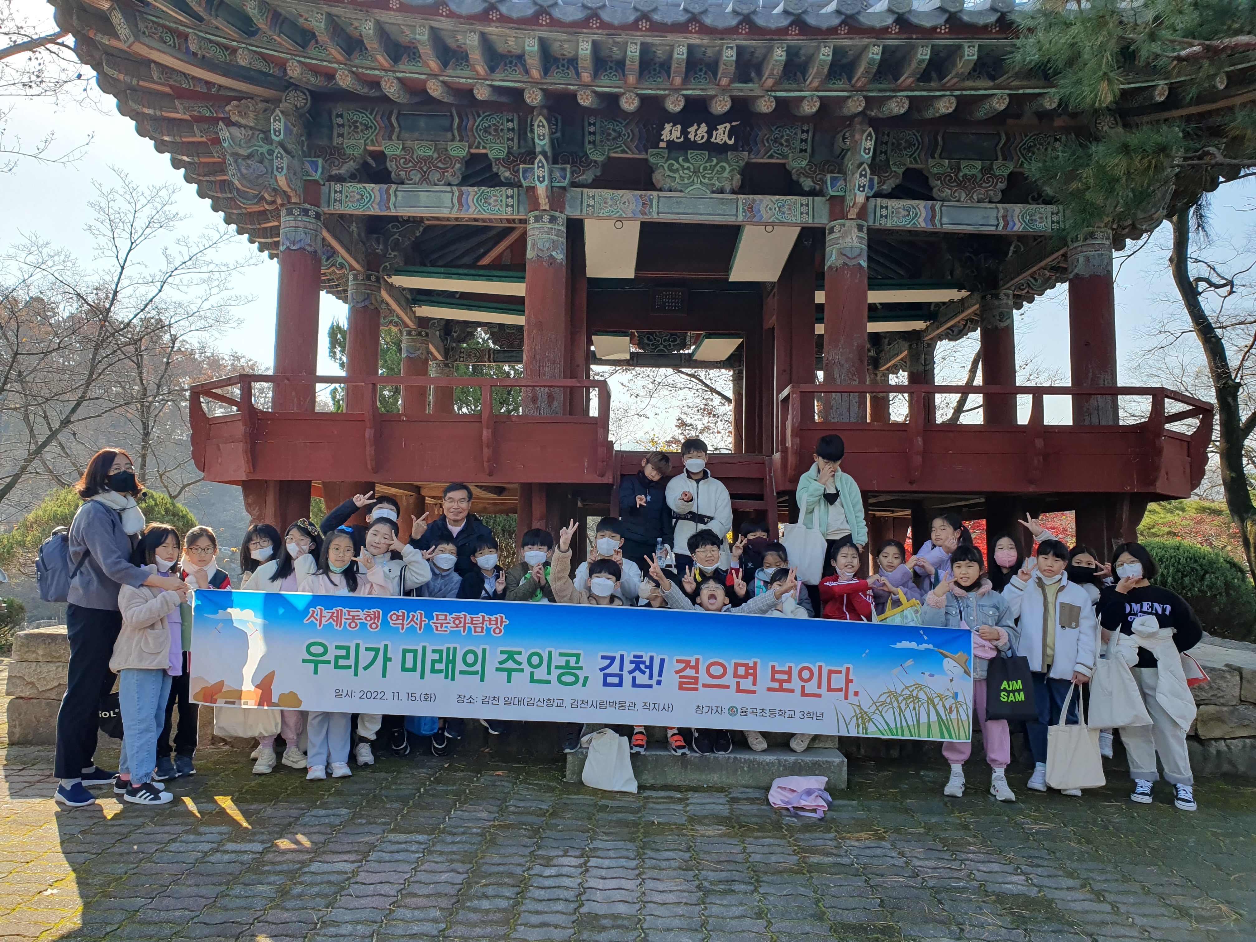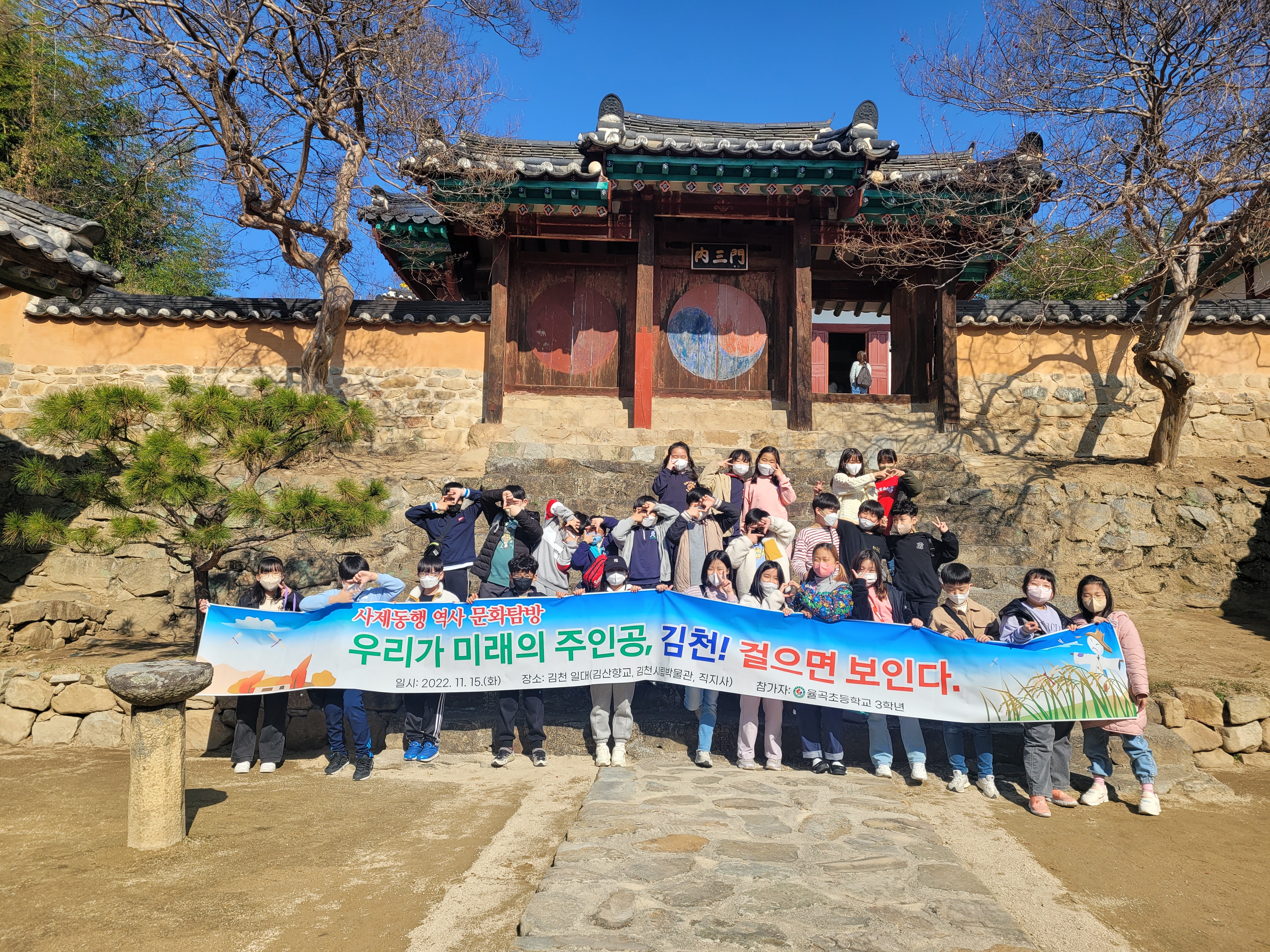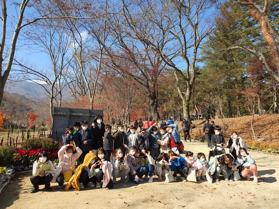 율곡초등학교(교장 김한수)는 11월 15일(화) 3학년 학생(205명)들을 대상으로 학교에서 배운 우리 지역 3학년 사회과 보조교재 「문화 예술의 고장 김천」에 실린 내용을 좀 더 구체적으로 살펴보기 위하여 ‘남산공원, 김산향교와 연화지, 직지사와 김천시립박물관’을 탐방했다.