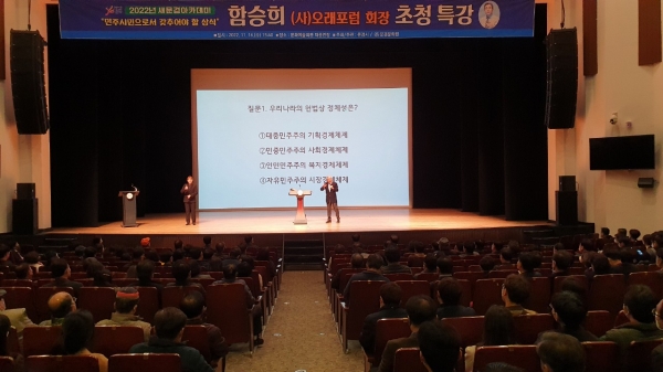 [금요저널] 문경시와 문경문화원은 16일 문화예술회관 대공연장에서 함승희 오래포럼 회장을 초청해‘민주시민으로서 갖추어야 할 상식’이라는 주제로 새문경아카데미 11월 특강을 개최했다.