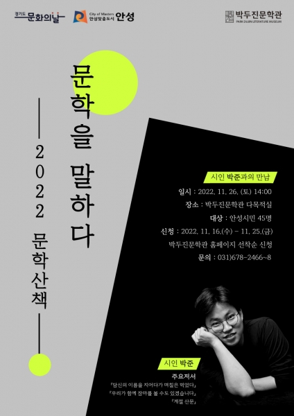 [금요저널] 안성시 박두진문학관은 오는 11월 26일 박두진문학관 다목적실에서 박준 시인과 함께 문학이 있는 경기도 문화의 날 ‘2022 문학산책: 문학을 말하다’를 운영한다.