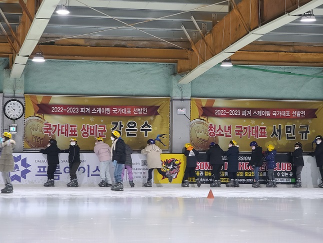 ■ 먼저 아이스링크장에 도착한 학생들은 안전교육을 받으며 안전수칙을 익힌 후 헬멧과 장갑, 스케이트를 착용하고 체험을 시작하였다. 스케이트의 기본 기능인 바로 서기와 V자 걸음마, 제자리에서 스케이트 밀기 등을 연습하면서 안전하게 빙판 위를 신나게 달렸다.