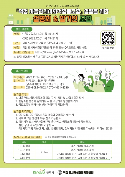 설립 설명회에 참석을 희망하는 시민은 포스터에 있는 QR코드로 사전 신청하거나 덕정 도시재생현장지원센터를 방문해 신청하면 된다.