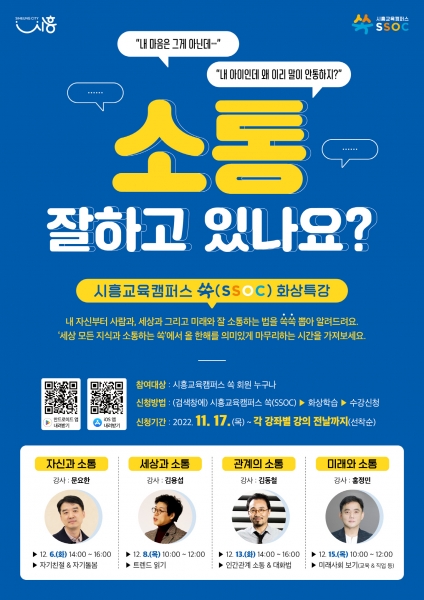 [금요저널] 시흥시가 배움으로 소통을 강화하고 시민 학습 참여를 확대하기 위해 ‘소통으로 채워가는 삶’이라는 주제로 ‘시흥교육캠퍼스 쏙’ 화상학습 특강을 오는 12월 6일부터 총 4회에 걸쳐 진행한다고 밝혔다.