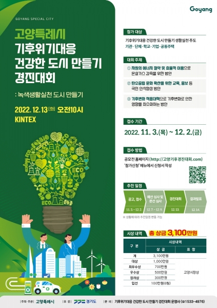 수상 기관에는 총 상금 3,100만원과 고양시장상이 주어지며 입선작은 전국의 지방자치단체에 사례를 공유해 기후변화대응 정책으로 확산될 수 있도록 할 계획이라고 전했다.