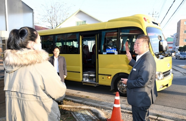 김 시장은 학생들이 가장 많이 편중된 와석초교의 등교시간에 맞춰 운영 중인 통학버스의 통학로를 직접 둘러보며 학부모 의견을 청취했다.