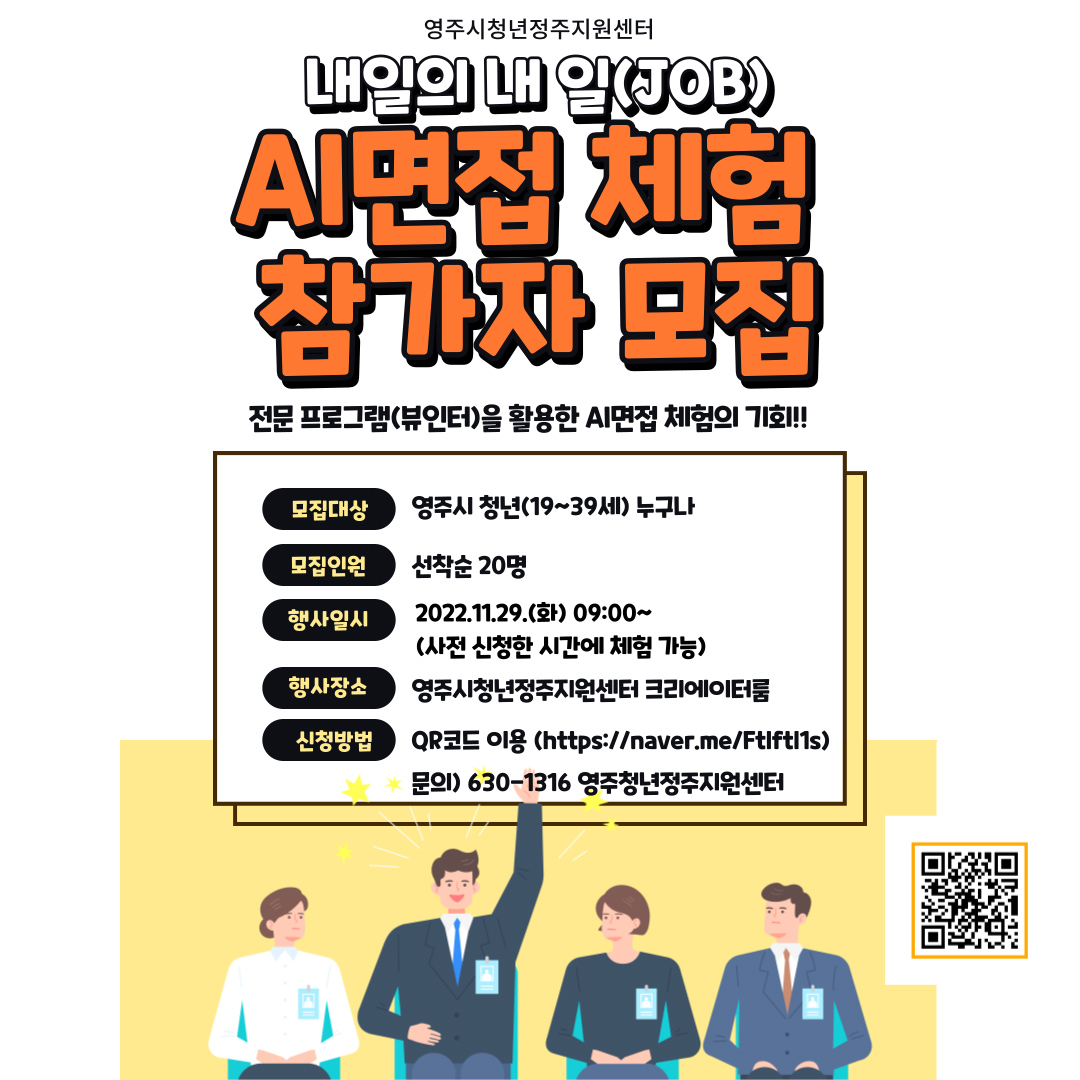 29일 진행하는 ‘내일의 내 일(JOB)’의 참가대상은 만 19세 이상 39세 이하의 영주시 청년이며, AI면접 프로그램을 활용한 면접 트레이닝 프로그램과 버크만 검사를 통한 진로탐색 컨설팅 프로그램으로 구성된다. 두 프로그램의 모집인원은 각 20명이며, 중복신청 가능하다.