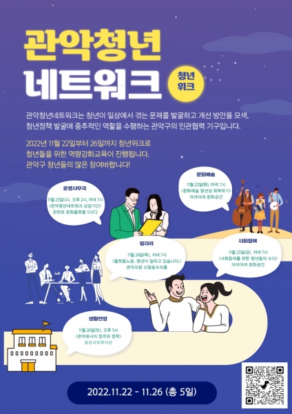 [금요저널] 관악구가 청년들의 주체적인 의제 발굴과 구정 정책 제안을 위해 오는 22일부터 26일까지 청년 위크 기간으로 정하고 ‘2022년 관악 청년네트워크 역량강화 교육’을 진행한다2020년 출범 후 3기를 맞이하는 관악 청년네트워크는 지역의 청년들이 모여 분과를 구성하고 청년들이 원하는 청년정책을 발굴, 제안하며 이와 관련된 포럼과 토론회를 개최하는 참여형 네트워크 사업이다.