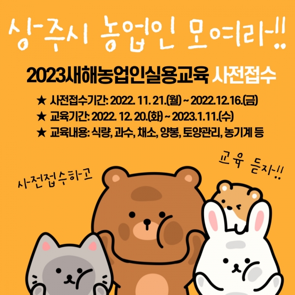 [금요저널] 상주시농업기술센터는 2022년 12월 20일부터 2023년 1월 11일까지 총 12개 과정, 20회에 걸쳐 1,800명을 대상으로 농업기술센터, 읍면회의실, 지역농협회의실 등에서 ‘2023 새해농업인실용교육’을 실시한다.
