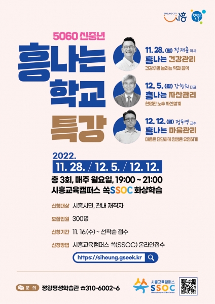 이번 특강은 흥나는 ‘건강’ 관리, 흥나는 ‘자산’ 관리, 흥나는 ‘마음’ 관리라는 주제로 온라인 학습공간인 시흥교육캠퍼스 ‘쏙’의 화상학습을 통해 진행되며 건강하고 적극적인 은퇴생활을 준비하고 싶은 45세 이상 시흥시민이면 누구나 참여할 수 있다.