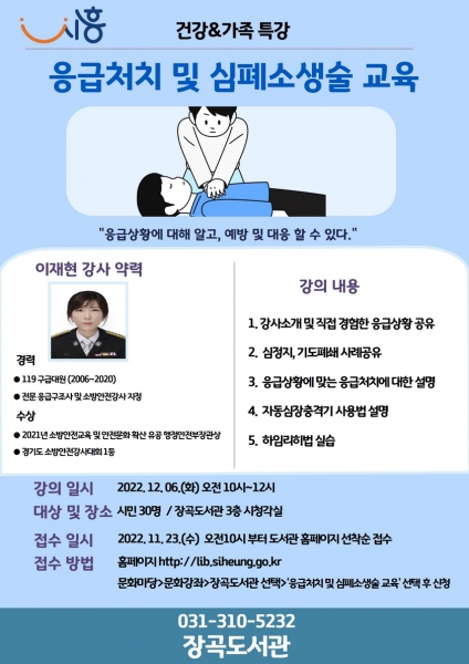 먼저, 시민들이 응급상황에 대해 알고 예방 및 대응할 수 있도록 해주는 강좌인 ‘응급처치 및 심폐소생술 교육’은 현재 소방서 119구급대원인 강사가 12월 6일 오전 10시부터 12시까지 시민 30명을 대상으로 장곡도서관 3층 시청각실에서 진행한다.