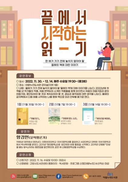 [금요저널] 고양특례시 아람누리도서관이 독서문화프로그램 ‘끝에서 시작하는 읽기’를 오는 11월 30일부터 12월 14일까지 매주 수요일 저녁 7시 30분, 3차시에 걸쳐 운영한다.