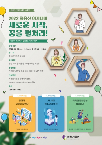 [금요저널] 안산시 최용신기념관은 개관 15주년을 기념해 관내 대입 수험생과청소년을 대상으로 최용신아카데미‘새로운 시작, 꿈을 펼쳐라’를 운영한다고 21일 밝혔다.