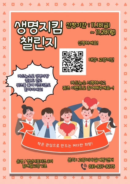 참여방법은 고양시자살예방센터 홈페이지와 인스타그램에 게시된 카드뉴스를 시청한 후 QR코드 접속을 통해 11월 28일까지 퀴즈 이벤트에 참여하면 된다.