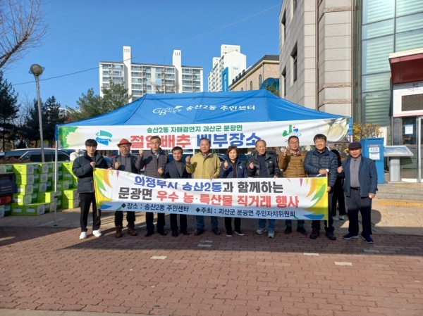[금요저널] 의정부시 송산2동 주민자치회는 김장철을 맞아 11월 18일 주민센터 주차장에서 자매결연지인 충북 괴산군 문광면의 절임배추를 사전 접수하고 이를 배부하는 농산물 직거래행사를 성공적으로 개최했다.