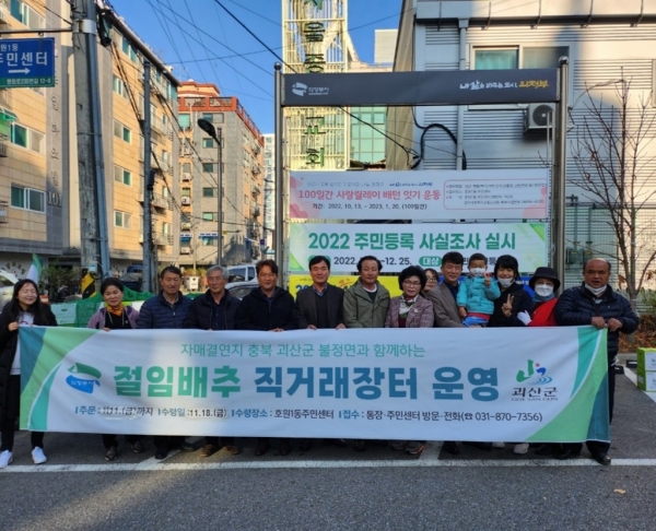 [금요저널] 의정부시 호원1동은 11월 18일 호원1동주민센터 앞에서 자매결연지 충청북도 괴산군 불정면과 함께 본격적인 김장철을 맞이해 우수한 품질의 농산물을 저렴한 가격으로 제공하는 절임배추 직거래 행사를 개최했다.