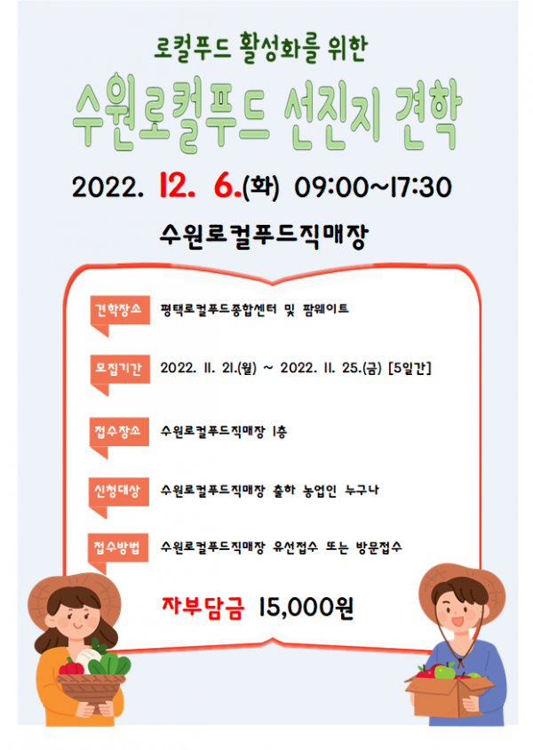 참가자들은 12월 6일 오전 9시에 수원로컬푸드직매장으로 집결해 평택로컬푸드종합센터와 팜에이트를 방문할 예정이다.
