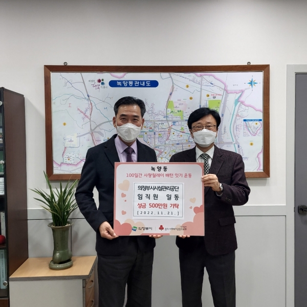 [금요저널] 의정부시 녹양동주민센터는 11월 21일 의정부시시설관리공단 임직원 일동이 사업장 소재지인 관내 저소득 취약 계층에게 사용해 달라며 성금 500만원을 기탁했다고 밝혔다.