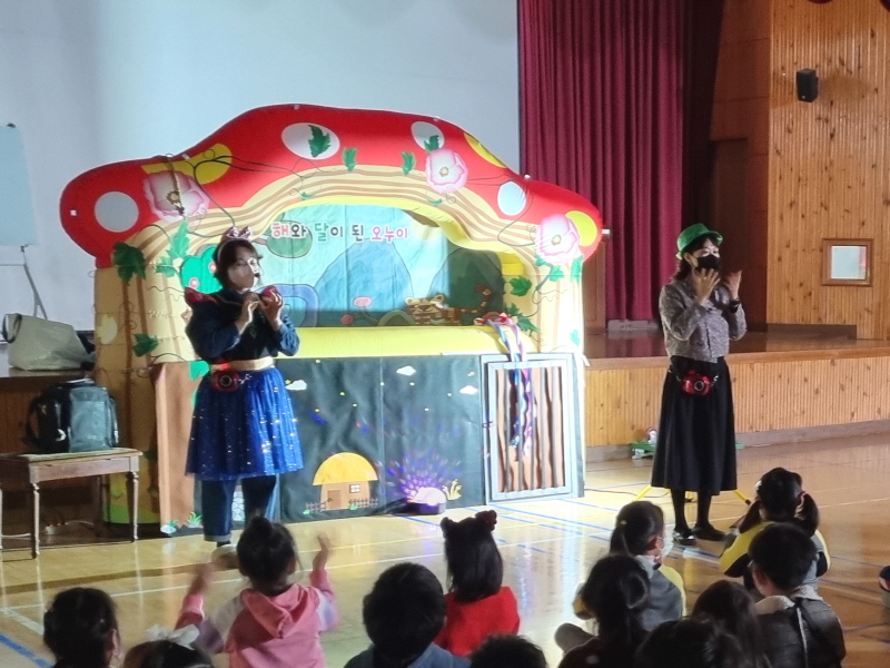 본 공연은 평소 친숙한 ‘해와 달이 된 오누이’ 전래동화를 바탕으로 유아들이 참여할 수 있고, 유머 있는 대사로 재구성한 인형극으로 유아들의 몰입도를 높였다. 공연은 배우가 등장하여 앞 줄거리를 마술, 게임과 함께 시작하였고, 이어서 귀여운 손인형을 등장시켜 극의 하이라이트를 연기하였다.