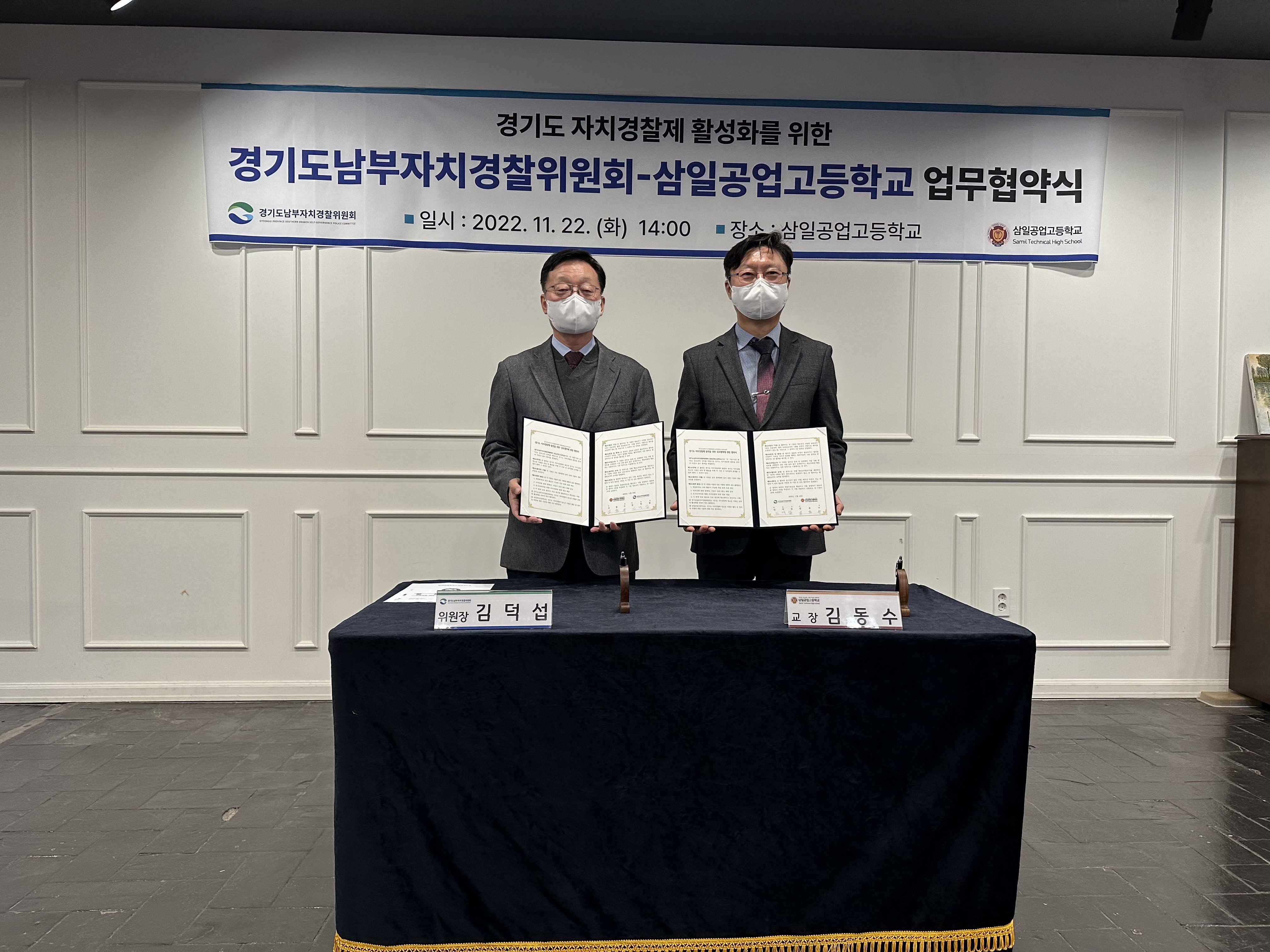 김덕섭 경기도남부자치경찰위원장과 김동수 삼일공업고등학교 교장은 22일 삼일공고에서 이런 내용이 담긴 업무협약을 체결하고 경기도 자치경찰 청소년 지원단 발대식을 진행했다.