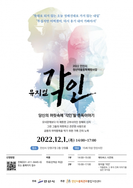 [금요저널] 안산시 중독관리통합지원센터는 오는 12월 1일 오후 2시 단원구청 단원홀에서 청년층 마약중독 예방을 위해 뮤지컬‘각인’을 무료로 공연한다고 24일 밝혔다.