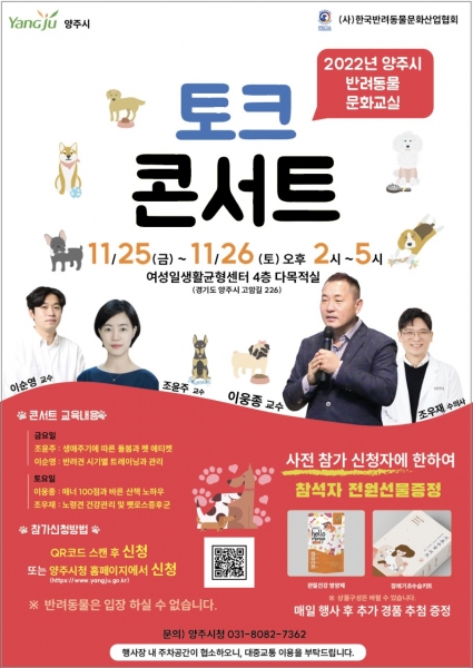 토크콘서트에 참여를 희망하는 시민은 양주시청 홈페이지 또는 포스터 QR코드를 통해 신청할 수 있으며 다만 반려동물과 동반입장을 불가능하다.